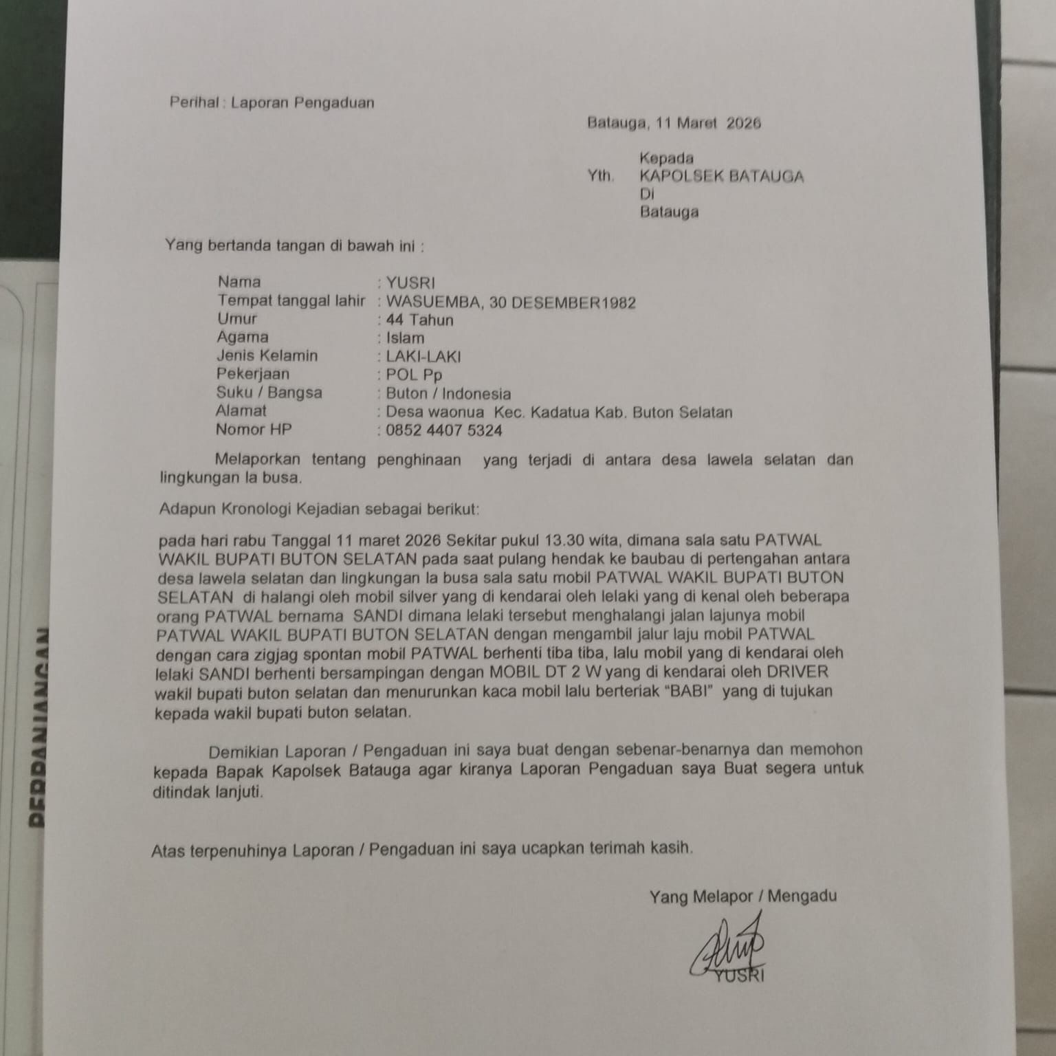 BATAUGA – Dugaan penghinaan terhadap rombongan pengawalan (patwal) Wakil Bupati Kabupaten Buton Selatan (Busel), Sulawesi Tenggara, berujung laporan ke pihak kepolisian. Seorang anggota Satpol PP bernama Yusri melaporkan insiden tersebut ke Polsek Batauga pada Rabu (11/3/2026).