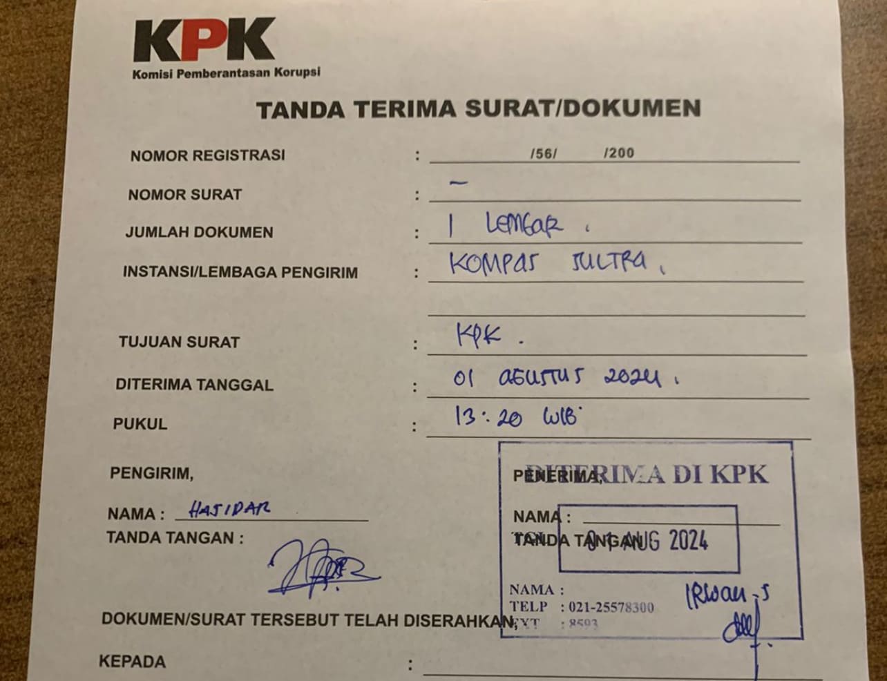Ketua Umum Kompas Sultra, Hasidar, mengatakan bahwa hari ini pihaknya resmi melaporkan Bupati Konsel dua periode ke KPK RI, atas dugaan terlibat dalam korupsi pertambangan dan pelaksanaan proyek yang diduga dikerjakan oleh anak dan keluarganya.