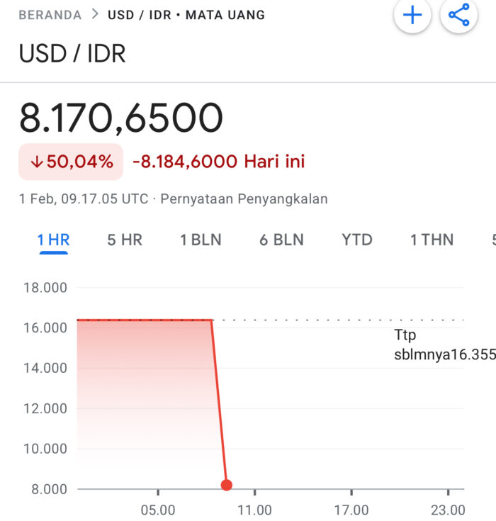 Jakarta, – Masyarakat dan pelaku pasar dibuat heboh setelah mesin pencari Google Sabtu, 1/2/2025, menampilkan nilai tukar rupiah terhadap dolar AS di angka Rp 8.170,65 per dolar. Angka ini jauh dari realitas pasar, yang saat ini berada di kisaran Rp 16.300 per dolar AS.