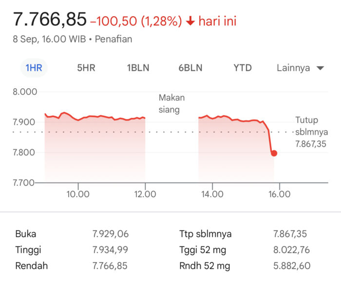 Data perdagangan mencatat, IHSG berada di level 7.818,12 atau turun 0,63 persen pada pukul 15.43 WIB. Sebelumnya, indeks bahkan sempat jatuh lebih dalam melewati ambang minus 1 persen.