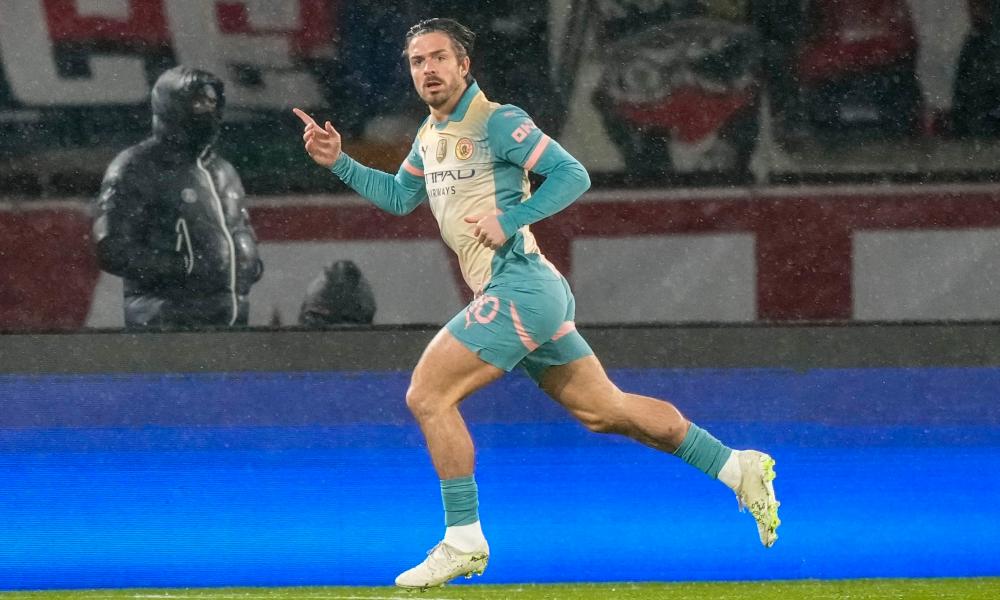 Pemain Manchester City, Jack Grealish, menceploskan bola ke gawang untuk membuka skor. Foto: Michel Euler / AP