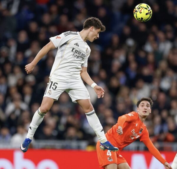 Arda Güler melakukan sundulan ke Gawang Real Sociedad.