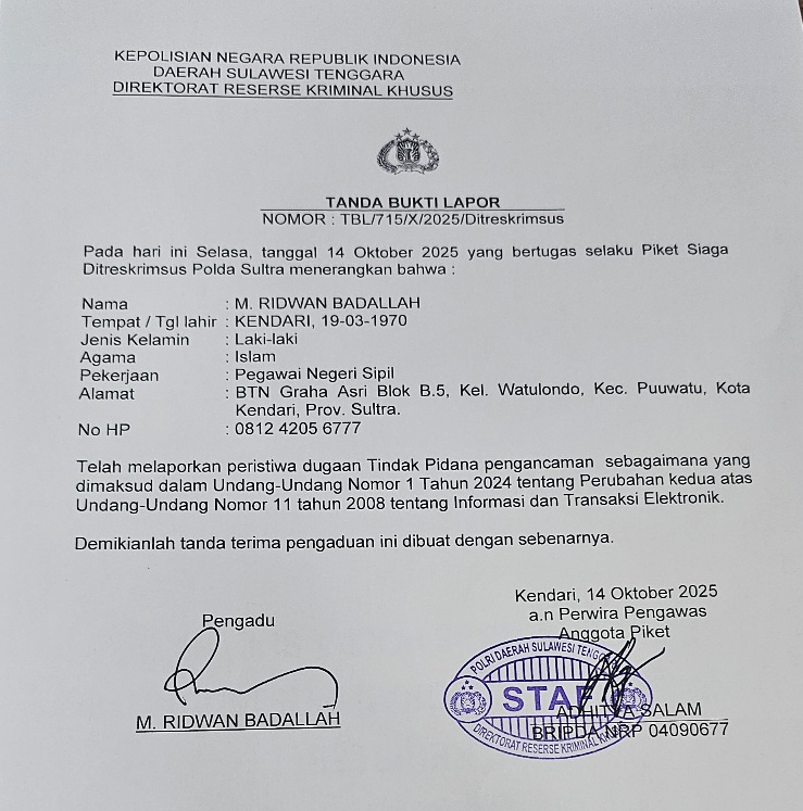 “Ada dua laporan berbeda, tapi saling berkaitan. Satu terkait unggahan fitnah di Facebook, dan satu lagi soal ancaman yang dikirim melalui WhatsApp,” jelas Ridwan di Kendari, Selasa (14/10/2025).