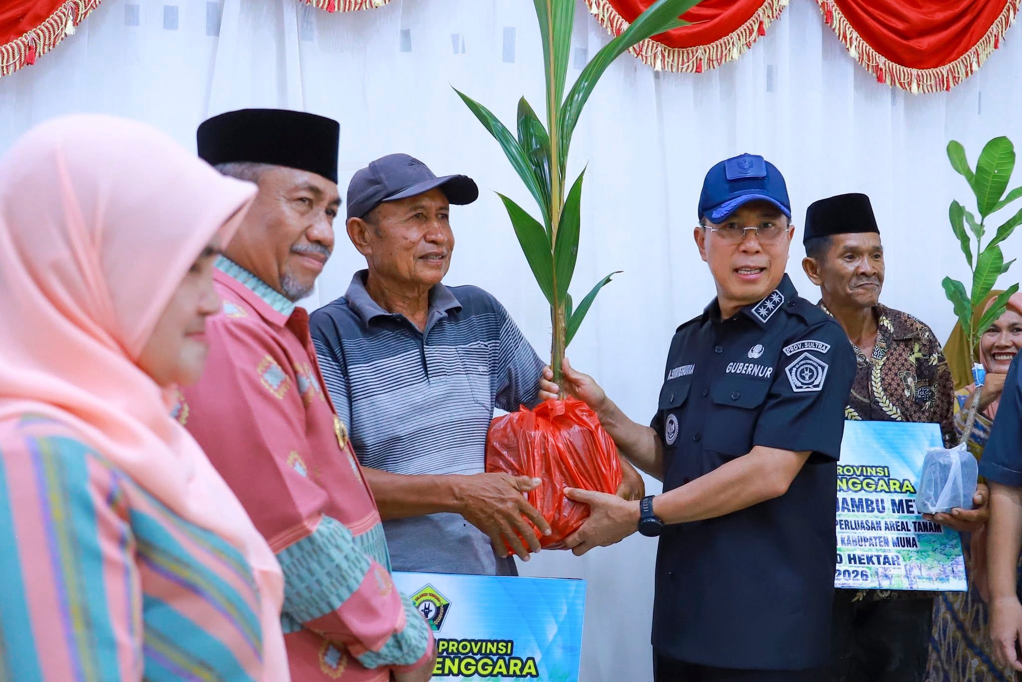 Sementara itu, di Kabupaten Muna, Gubernur menyalurkan bantuan benih kelapa dan jambu mete kepada kelompok tani sebagai upaya mendukung pengembangan sektor perkebunan.