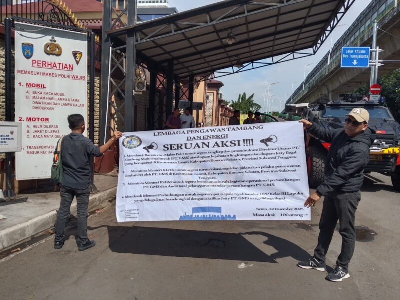 JAKARTA – Dugaan kejahatan lingkungan dan praktik pertambangan ilegal di Kecamatan Laonti, Kabupaten Konawe Selatan, Sulawesi Tenggara, kini resmi dibawa ke pusat kekuasaan hukum nasional. Lembaga Pengawas Pertambangan dan Energi (LPTE) menggelar aksi unjuk rasa di depan Mabes Polri, Senin (22/12/2025), mendesak Bareskrim Polri segera menangkap Direktur Utama PT Gerbang Multi Sejahtera (PT GMS).
