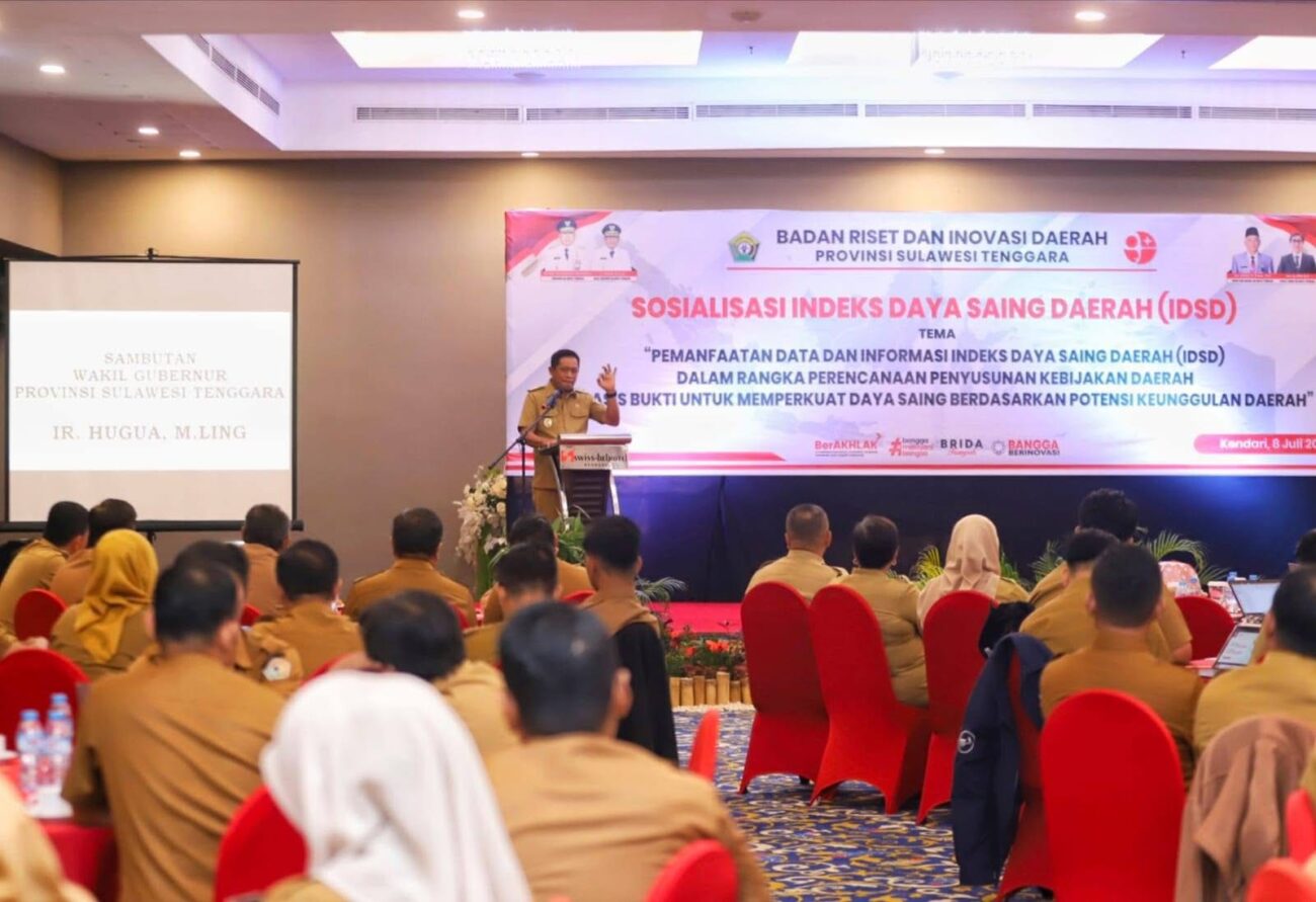 Kendari,– Wakil Gubernur Sulawesi Tenggara, Ir. Hugua, M.Ling., membuka Sosialisasi Indeks Daya Saing Daerah (IDSD) yang digelar Brida Sultra di Swiss-Belhotel Kendari, Selasa (8/7/2025). Kegiatan ini dihadiri perwakilan BRIN, OPD lingkup provinsi, dan kabupaten/kota.